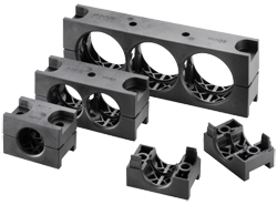 Uchwyty wielootworowe BGPM pozwalają na mocowanie rur karbowanych PMAFLEX równolegle. Uchwyty BGPM są produkowane ze specjalnie modyfikowanego poliamidu. Materiał ten jest samogasnący, wolny od związków halogenów, fosforu i kadmu oraz bardzo odporny na uderzenia.